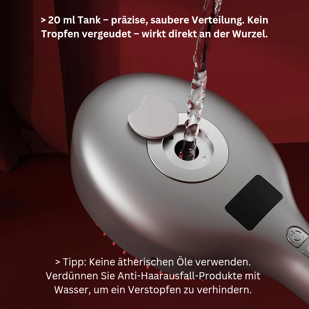 Mit sanfter Massage, Rotlicht-Therapie & Pflegespray bringt sie deine Kopfhaut ins Gleichgewicht und lässt dein Haar wieder glänzen – ganz ohne Aufwand.